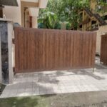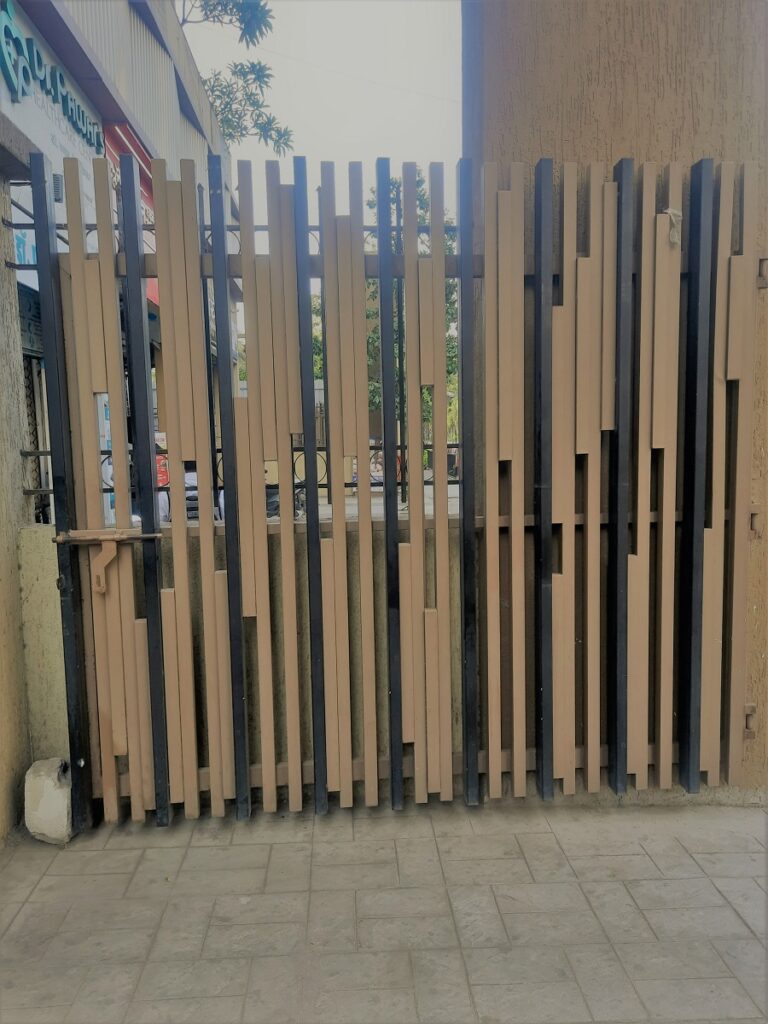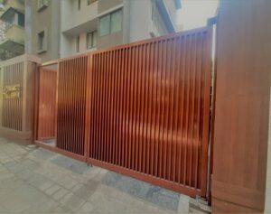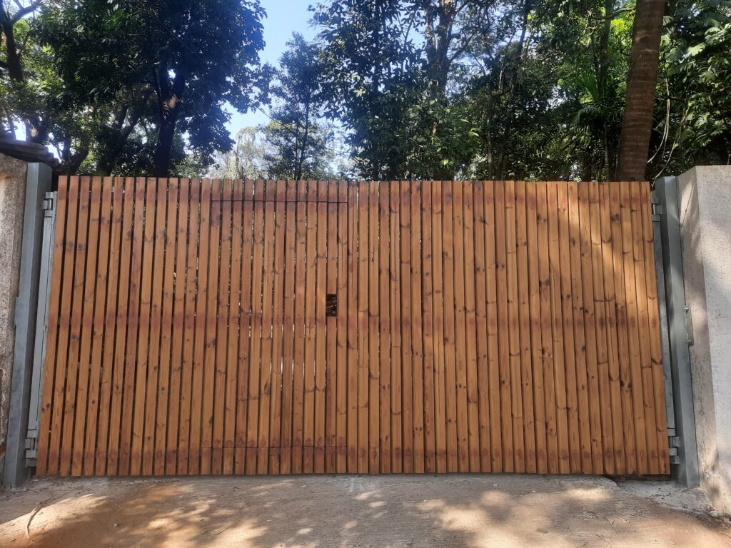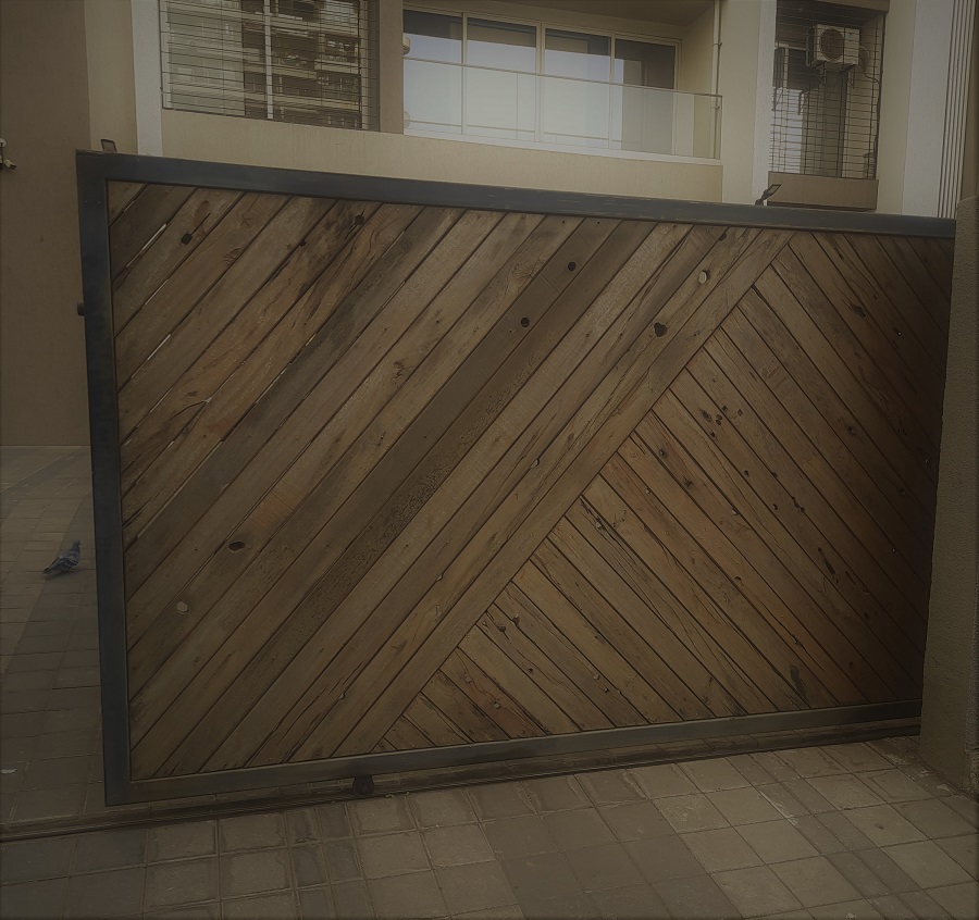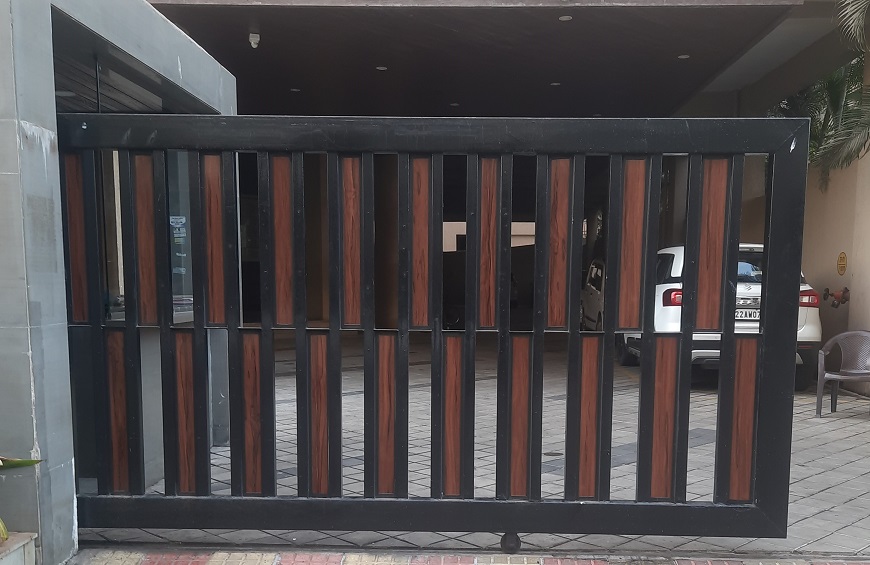 Modern day gates are designed with hollow MS sections of larger sizes than is normally possible with wrought iron bars. There are a number of cladding options available such as wood, WPC or shera board planks etc depending on the final finish.