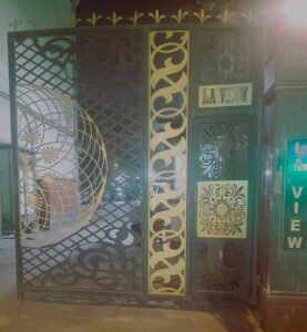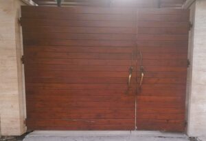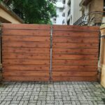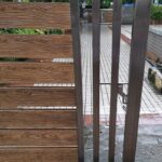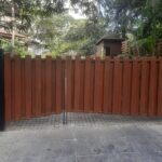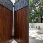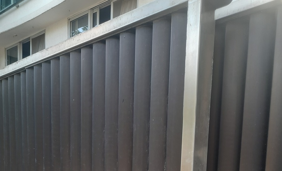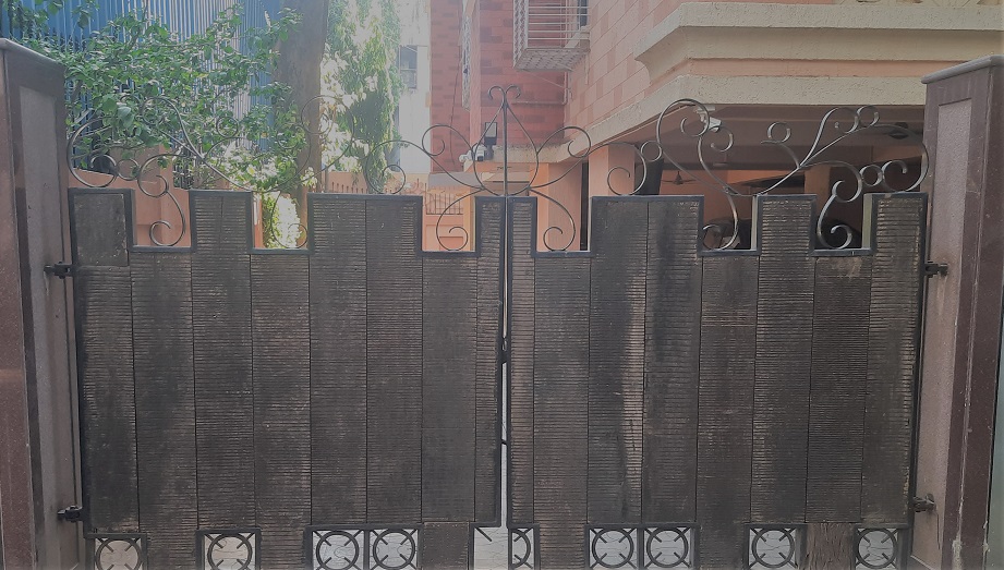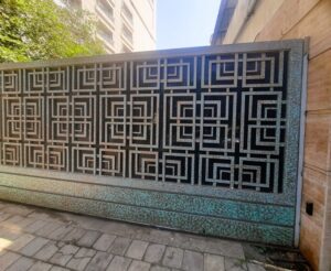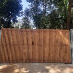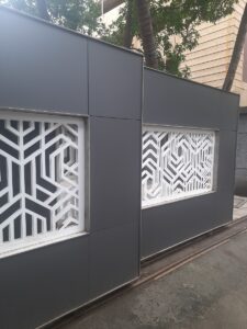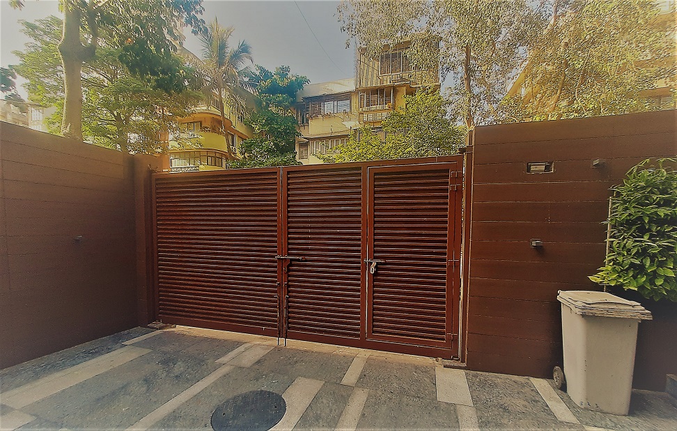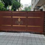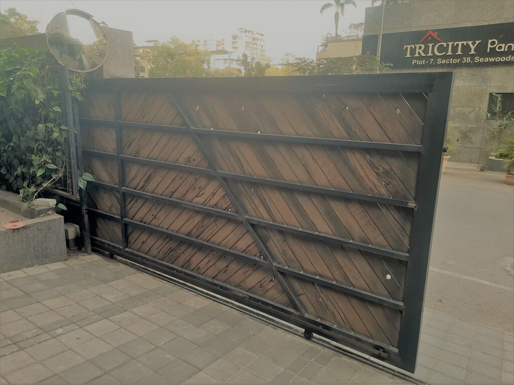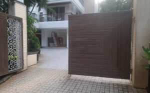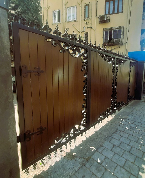 Modern day gates are designed with hollow MS sections of larger sizes than is normally possible with wrought iron bars. There are a number of cladding options available such as wood, WPC or shera board planks etc depending on the final finish.
